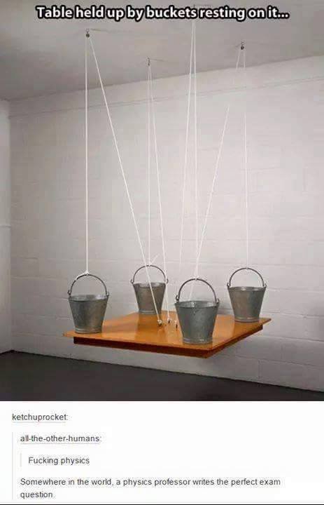 That really isn't so strange. The buckets or their contents have to collectively weigh more than the table does, right? And of course, the buckets/contents have to all weigh roughly the same.