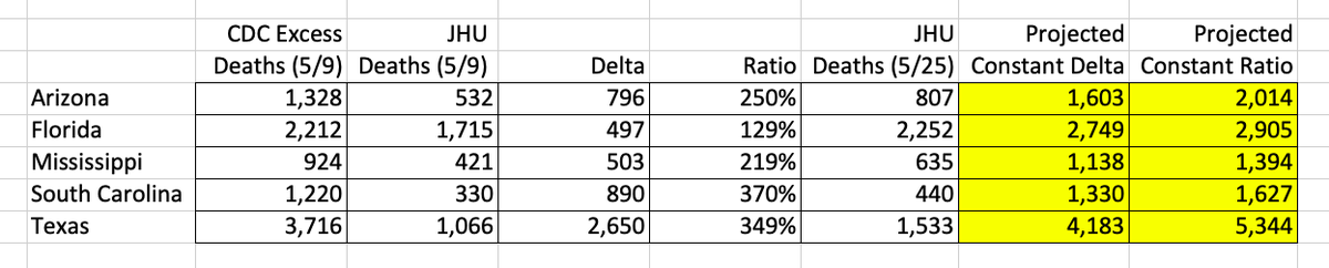 (5) The CDC Excess Deaths dataset was updated on 5/20 and provided data thru 5/9. The only extrapolation I made was in the last two rows of the table.pic.twitter.com/nPY3vOWsBO