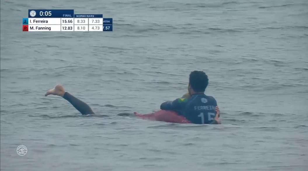 So close! Retiring champ Mick Fanning hugs Italo Ferreira while the ocean lay flat with the clock ticking down on the
