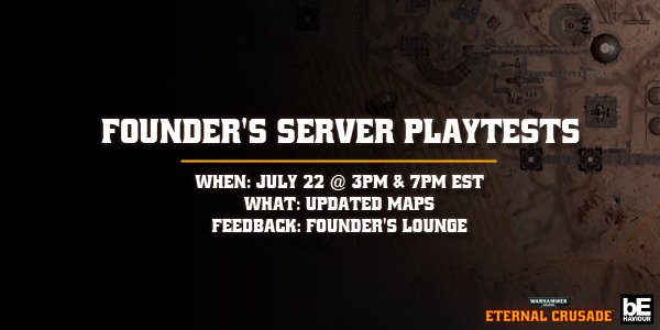Founders, join us Friday to playtest two updated #40kcrusade maps! (Founders Server, 3pm & 7pm EST)pic.twitter.com/ILg5wJXdey