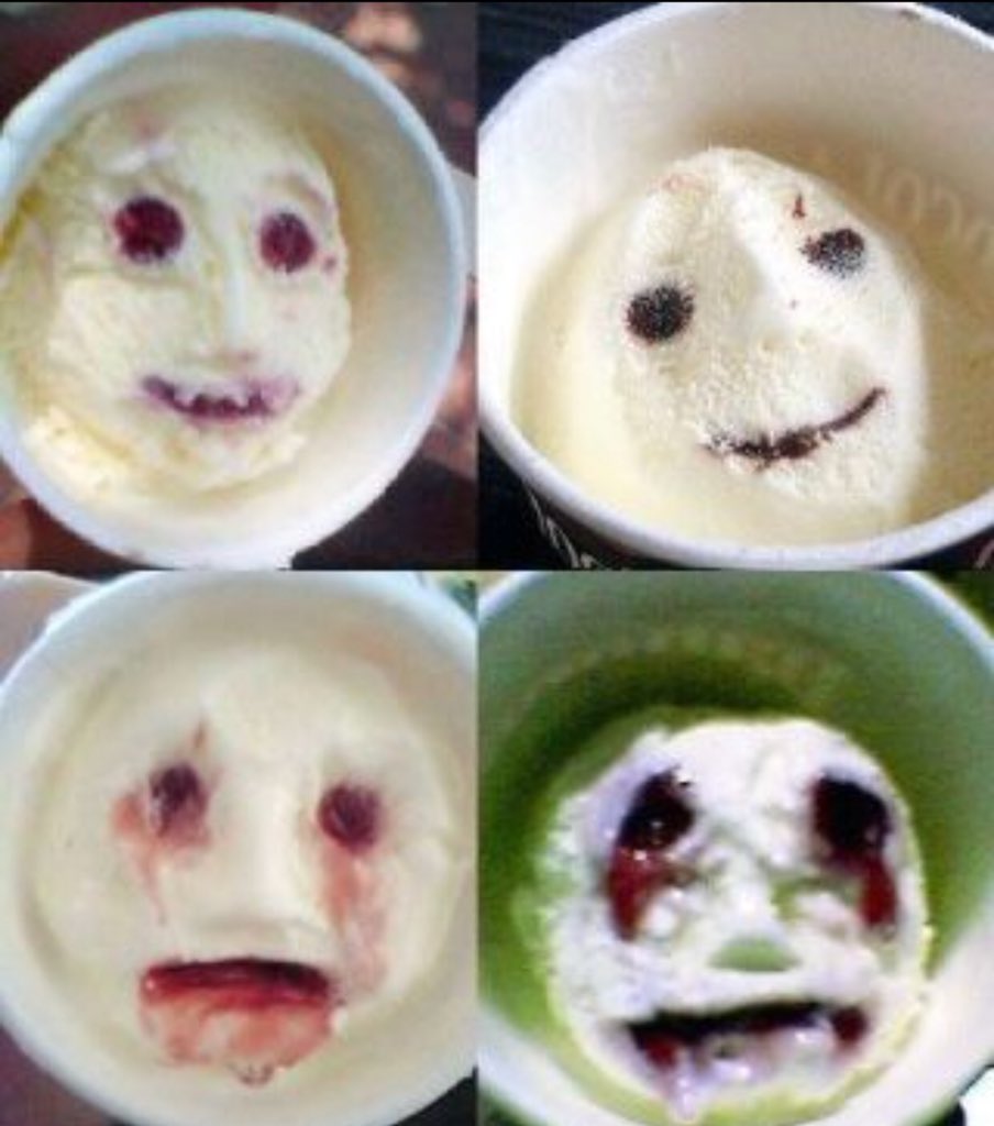 Short answer: It doesn't. Long answer: It's just icecream with a smiley face, when the person who ate the one in the picture was eating it, they just removed icecream in such a way so as to make a scary vampire face out of it.
