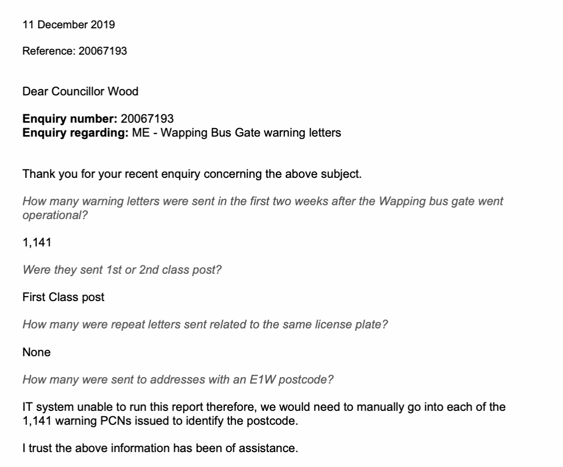 Wapping bus gate question response 1,141 warning letters sent in 1st two weeks of operation but note none sent more than once to the same license plate Not able to identify how many sent to E1W postcodes!