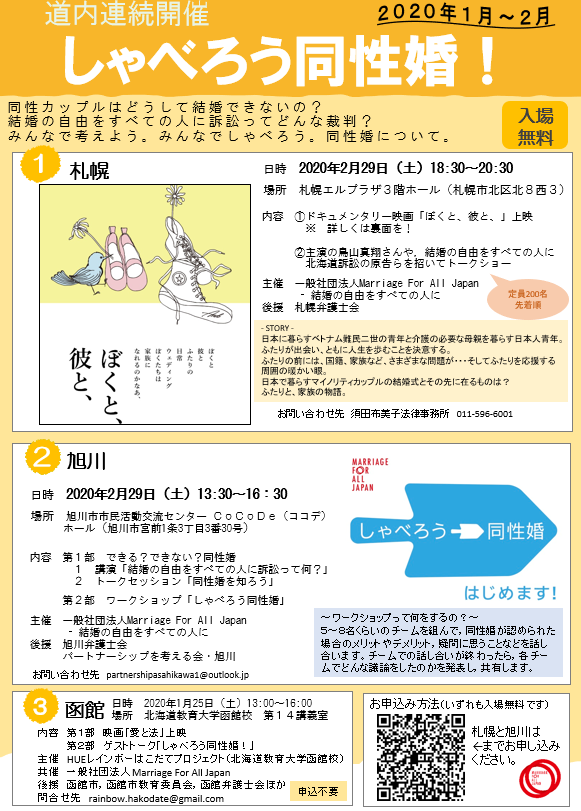 【旭川・札幌】同性婚について考えるイベント「しゃべろう同性婚」が2月29日(土)旭川(13:30〜16:30/CoCoDe・宮前1条3丁目)と札幌(18:30〜20:30/札幌エルプラザ・札幌駅北口)で行われます。参加無料。旭川はトークセッションやワークショップ、札幌は映画「ぼくと、彼と、」が上映されます。pic.twitter.com/JeqpTQeYh9