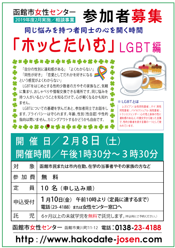 【函館】函館市民または市内在勤在学のLGBT当事者とその家族の方々を対象とした交流会「ホッとたいむ LGBT編」が、函館市女性センター(東川町)の主催で、2月8日(土)13時半から開催されます。当事者のスタッフもいますので、ぜひご参加ください。参加無料、事前申し込みが必要、託児もあります!pic.twitter.com/0cnpCThFFU