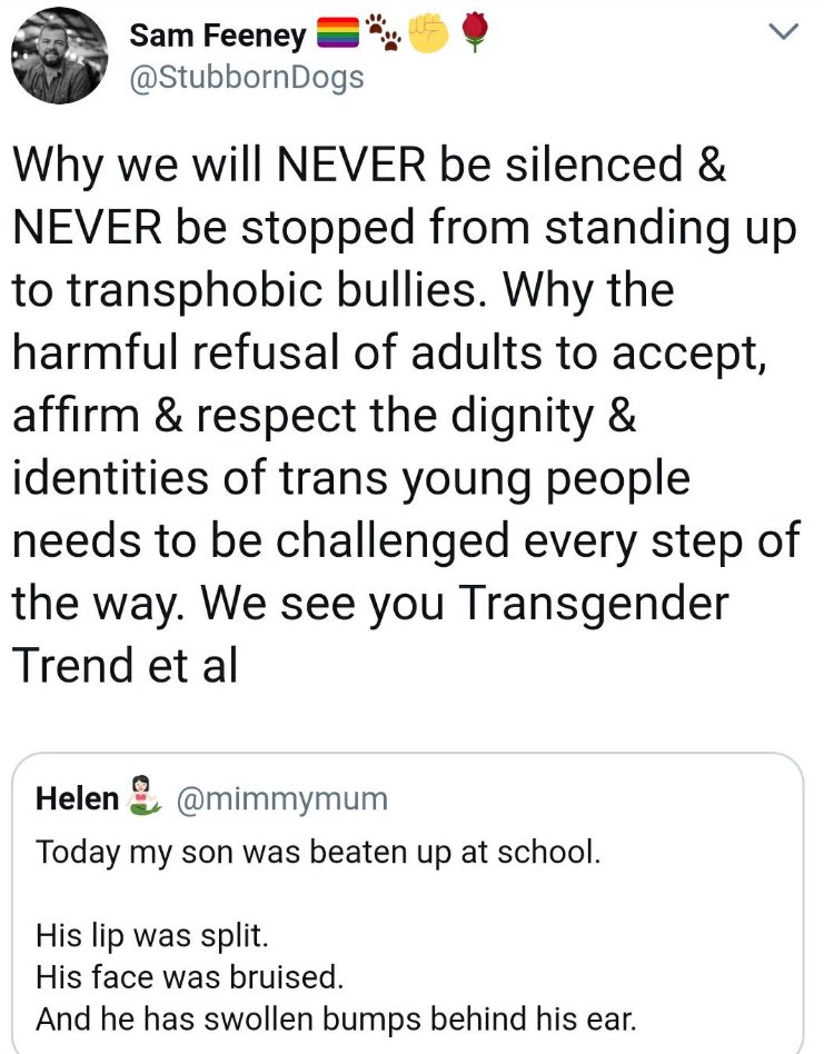 It is terrible that this child was bullied at school. Yet suggesting that it’s the fault of @Transgendertrd is disingenuous and absurd. Using the child as some sort of ideology-supporting trophy is both irrational & opportunistic.pic.twitter.com/cFlGoWkgFB