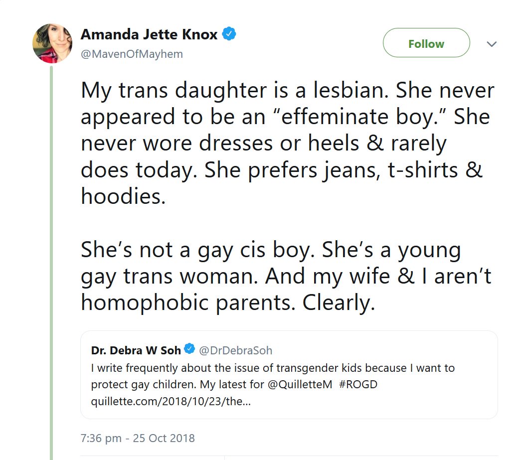 You seem to believe all families are like yours. Can you even consider the possibility that there are SOME kids wrongly endorsed (by parents/gender docs) in the notion they're "really" the opp sex who would otherwise grow up to be LGB w/no need for medical interference? https://twitter.com/MavenOfMayhem/status/1055649417171165184 …