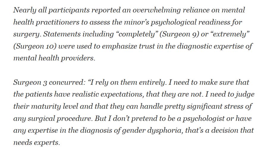 Suggest you read this paper. The surgeons who were surveyed make very clear that they rely on psychologists/psychiatrists for diagnosis of gender dysphoria/readiness for surgery, and follow their lead. http://www.jsm.jsexmed.org/article/S1743-6095(17)30108-X/pdf …pic.twitter.com/X2ApuTkFps