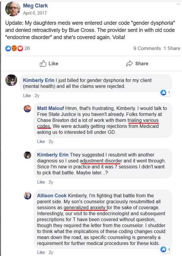 It's pretty common, evidently. Here are a few live posts [from the PUBLIC Transgender Health facebook page, so no anonymizing] discussing denials and use of alternate billing codes.pic.twitter.com/LgM3X6V6XO