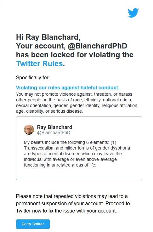 Ray @BlanchardPhD has his account locked--for tweeting his opinions, based on decades of peer-reviewed research and clinical observation.