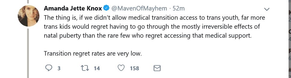 It's not enough for Knox to endlessly tweet about her own trans kid & spouse (both MTF) & her claim that she has "always been a lesbian." She injects herself into threads when anyone questions the affirmative model of care. She also regularly peddles "suicide or transition."pic.twitter.com/lnoJkC8dw3