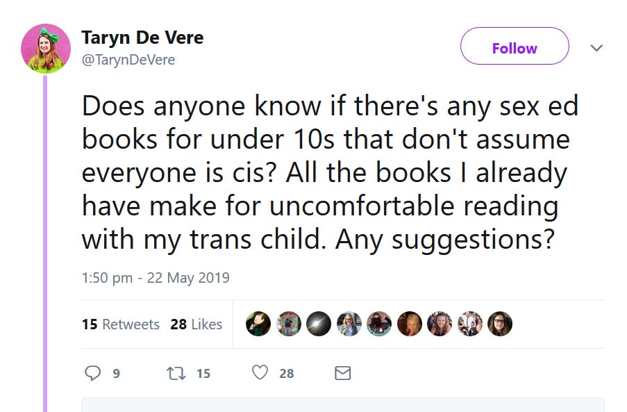 She's been recommended V Is for Vulva (soon to be published) and Cory Silverberg's What Makes a Baby. The latter has lines like “Some babies are born by coming out through a part of the body that most people call the vagina,” & refuses to use the words male, female, man, woman.
