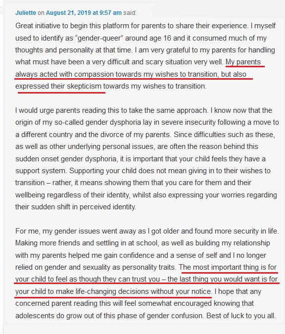 Nuanced advice from a former trans-identified young person: "The most important thing is for your child to feel as though they can trust you – the last thing you would want is for your child to make life-changing decisions without your notice." https://4thwavenow.com/about/comment-page-9/#comment-33297 …pic.twitter.com/qbIhazwRWf