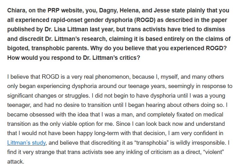 And there's this: "I believe that ROGD is a very real ...I did not begin to have dysphoria until I was a young teenager, and had no desire to transition until I began hearing about others doing so...I am very confident in Littman’s study." https://4thwavenow.com/2019/02/27/a-grand-conspiracy-to-tell-the-truth-an-interview-with-4thwavenow-founder-her-daughter-chiara-of-the-pique-resilience-project/ …pic.twitter.com/wZo6F5S2il