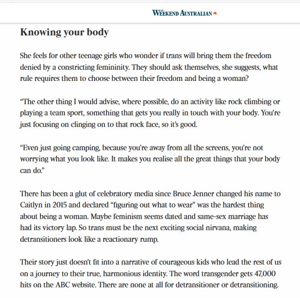 1. Thread. Detransition featured in @australian today: 23-yr-old New Zealand detransitioned lesbian, @PiqueResProject highighted with one of their Q&A videos embedded in piece, plus quotes from 4thWaveNow founder. Paywalled. More screenshots to come. https://www.theaustralian.com.au/inquirer/about-a-girl-and-the-decision-to-detransition/news-story/ …pic.twitter.com/syrJoCCXrn
