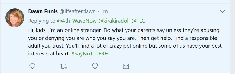 Also last year, Ennis pontificated that the Dutch clinicians who pioneered puberty blockers aren't trustworthy because they practice watchful waiting vs. immediate affirmation. (Late-transitioning MTFs are often champions of pediatric transition.)https://twitter.com/4th_WaveNow/status/972318518942236672 …