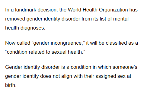 Removing this from Mental Disorders is as significant as it was removing homosexuality from Mental Disorders decades ago. Unfortunately this won't change everyone's views - incl/esp so-called "professionals" who are invested in viewing sexual/gender variations as pathological.