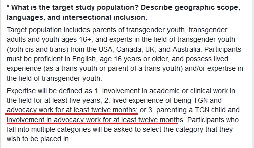 Imagine a survey of detransitioners/desisters, with a requirement that they (& their parents) must have been involved in "advocacy work" for a year or more. Transphobic! Biased! You only recruited people who agreed with your study premise! Anti-trans activists! Junk science!