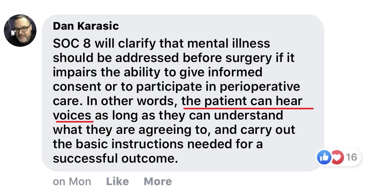 There's a discussion on the International Transgender Health FB page re: SRS for people w/ psychosis. Consensus amongst leading lights in US trans health care is that even hallucinations & multiple inpatient psych admissions shouldn't be a barrier to SRS. https://www.facebook.com/groups/transgenderhealth/permalink/2889293267781747/ …pic.twitter.com/HA5PuuYosG