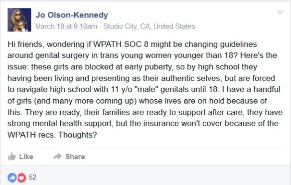 Clearly, the idea is to perform irreversible surgeries before kids can mature and change their minds. If too many change minds the whole social reconstruction project is ruined.