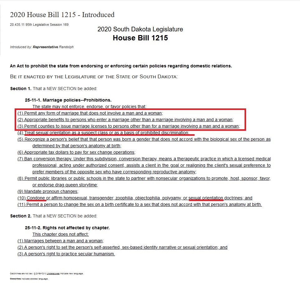 This timing of this South Dakota bill's introduction (yesterday) is suspicious. Which lawmakers are supporting and/or sponsoring it? This is actual bigotry. It enshrines discrimination into law, prohibits the state from protecting gay people in any way. https://sdlegislature.gov/Legislative_Session/Bills/Bill.aspx?File=HB1215P.html&Session=2020&Version=Introduced&Bill=1215&fbclid=IwAR0pNpQjF3Hr59JcZ0AJ5SOvpd4iyPytaJd0smvGnyHis0oAaPrtIPjBCYo …pic.twitter.com/SCQLp1d5Hr