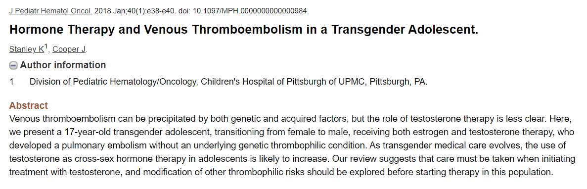 Two recent case studies, 17-year-old FTMs developing pulmonary embolism with testosterone injections.https://twitter.com/givethemseeds/status/1232511649866665984 …