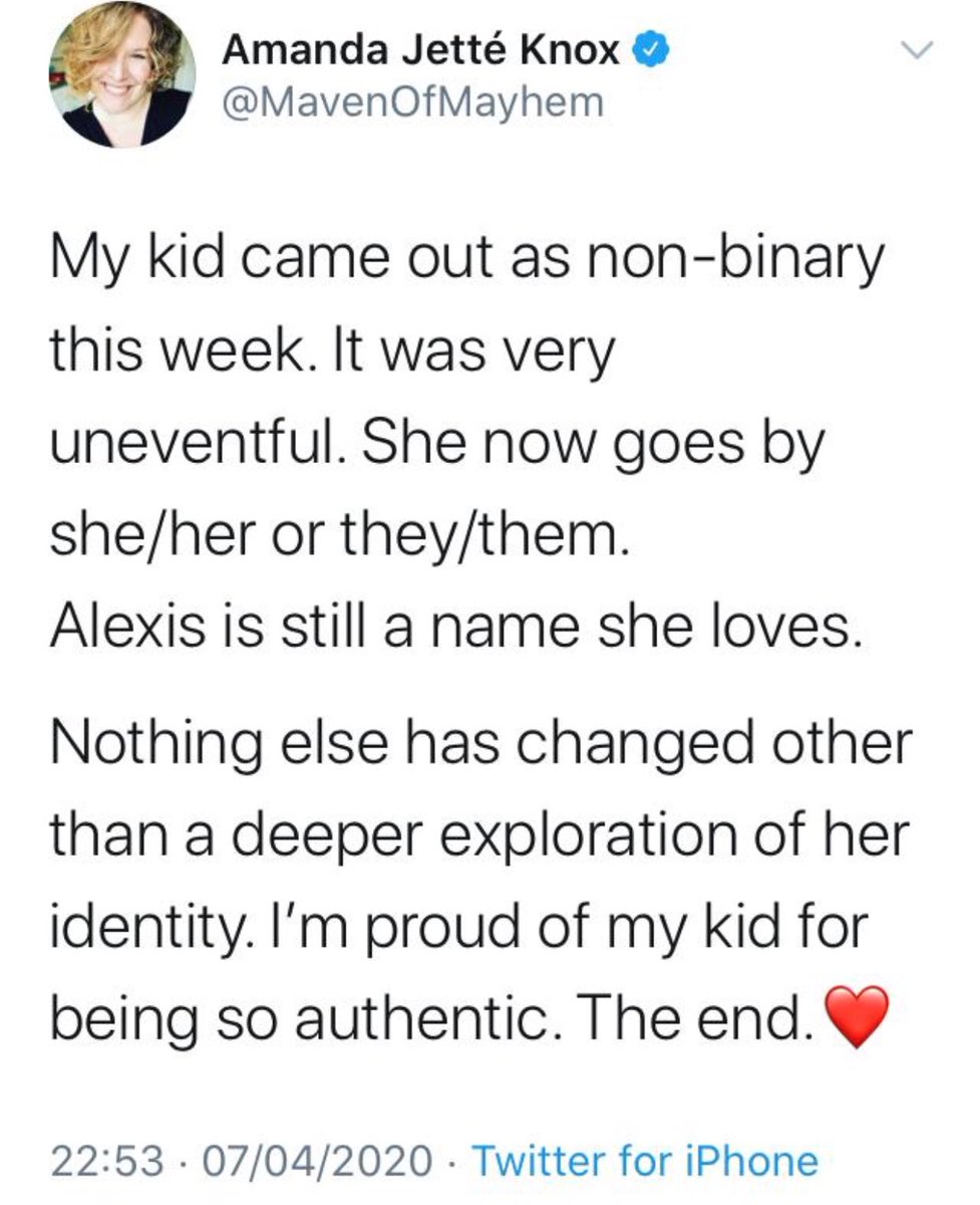 "My child came out 6 years ago as trans. At the time, she told us she was a girl." "At the time." (Child was 11) Trust trans kids! They KNOW who they are, if they're "persistent, consistent, insistent!" Guess "consistent" isn't so important after all.https://www.amandajetteknox.com/blog/2020/4/8/world-meet-my-non-binary-kid …