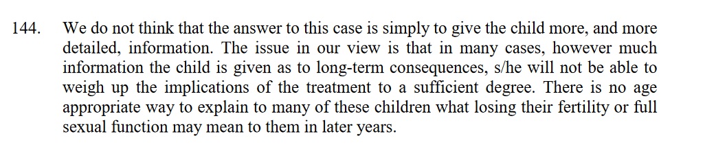 The UK judgment in the #KeiraBell case simply acknowledges the reality of child and adolescent cognitive development: "There is no age appropriate way to explain to many of these children what losing their fertility or full sexual function may mean to them in later life."pic.twitter.com/xGcZp403Qm