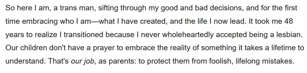 "As a former lesbian and current trans man, I maintain this is not transphobic. It is actually sensitive and caring to recognize that not just one treatment or pathway is right for all kids."pic.twitter.com/RBYl8xzn6j