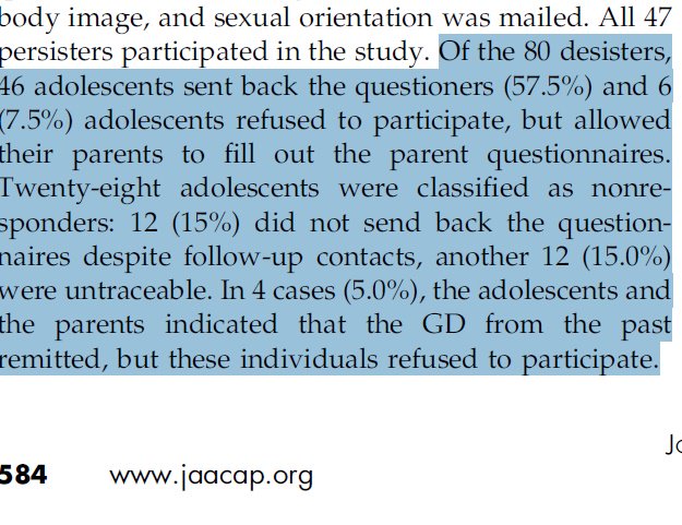 It wasn't a "majority." Did you read Singal's post? "Of the 80 desisters, 46 adolescents sent back the questioners (57.5%) and 6 (7.5%) adolescents refused to participate, but allowed their parents to fill out the parent questionnaires"