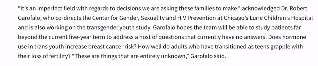 He admits it: current crop of "trans kids" are guinea pigs. Serious problems might result. He hopes to study them for many years to find out