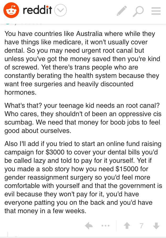 Root canal v. boob job: Who pays? https://www.reddit.com/r/GenderCritical/comments/65yzoi/who_pays_the_costs_of_transgender_medical/ …pic.twitter.com/F3YOMe3nH1
