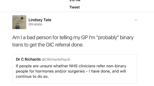 There is no research on what happens if you medically transition gender queer or gender fluid people. NONE.https://twitter.com/4th_WaveNow/status/865972554481127424 …