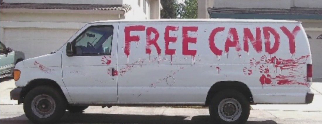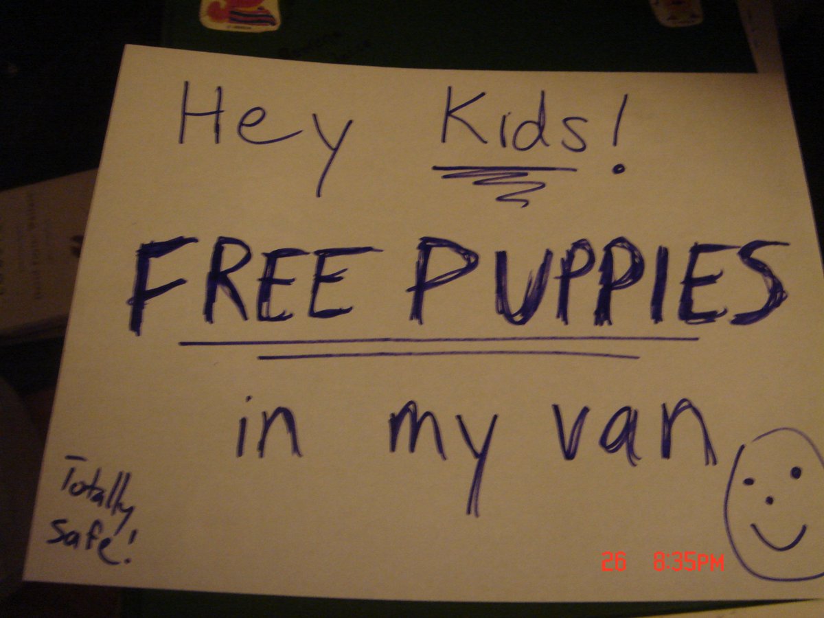 Using candy and puppies to entice children, like any experienced child-snatchers would.