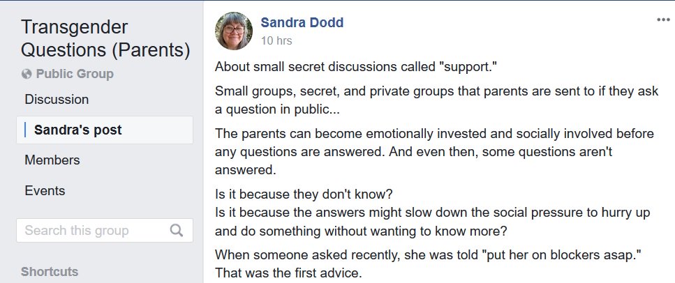 "Transgender Questions (Parents)" public Facebook group. Many interesting threads. McCarthyite censorship a major theme. "When someone asked recently, she was told 'put her on blockers asap'. That was the first advice." https://www.facebook.com/groups/374310149676721/permalink/376102272830842/ …pic.twitter.com/T43YwsRfiM