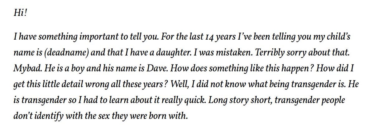 Dad instructs other parents how to convince skeptical relatives and friends how "normal", "great", and "exciting" it is to turn your 14-year-old daughter into a permanent medical patient. http://www.patheos.com/blogs/transparentexpedition/2017/12/transparenting-101-letter/ …pic.twitter.com/2ov5NFpeDS