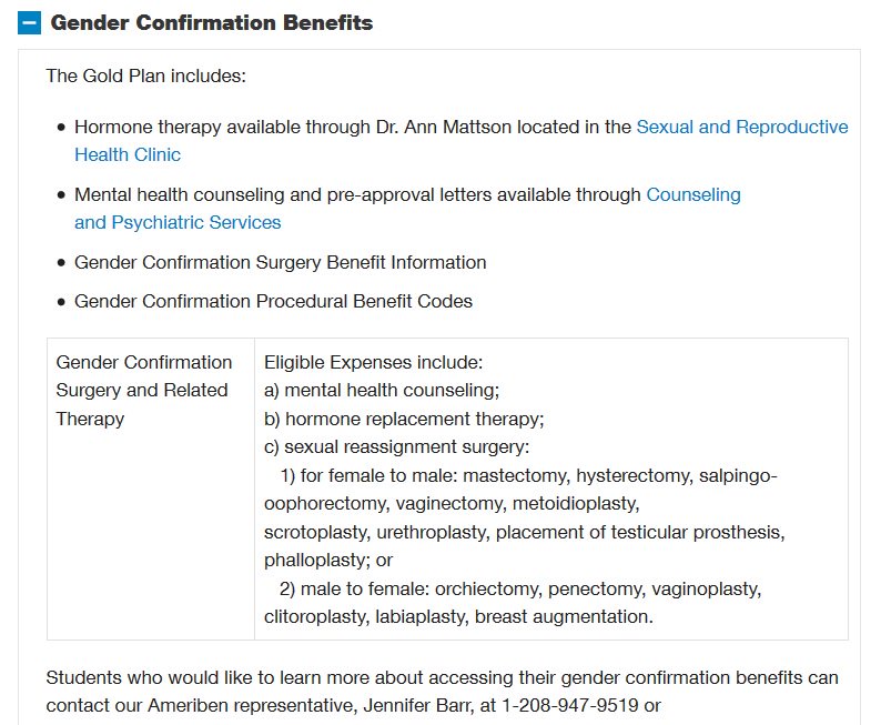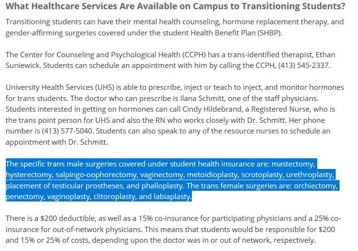 The University of Massachusetts, Amherst, covers phalloplasty, vaginoplasty, & more under its student health plan. https://www.umass.edu/stonewall/resources/umass-trans-resource-guide#fifteen … pic.twitter.com/5OUxvEEASm