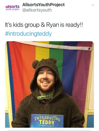 Seems All Sorts Youth deleted that tweet! Here's a screen shot of it: a youth worker dressed in a teddy bear suit, about to read the little ones a story about a transgender teddy bear. Kids, you too might be trans, but don't worry! Being trans is so special and fun! Try it! pic.twitter.com/Xif3YbKfPt
