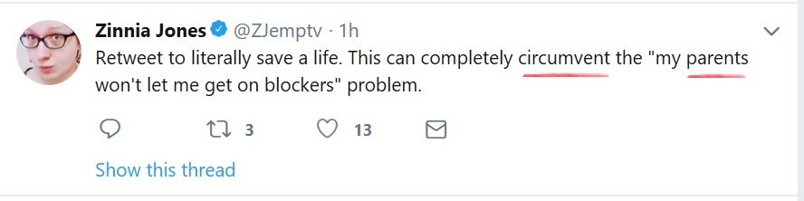 This individual was featured on @TLC "I am Jazz." Now is publicly recommending that kids seek puberty blockers on the Internet to go around their parents.https://twitter.com/4th_WaveNow/status/972154945129631744 …