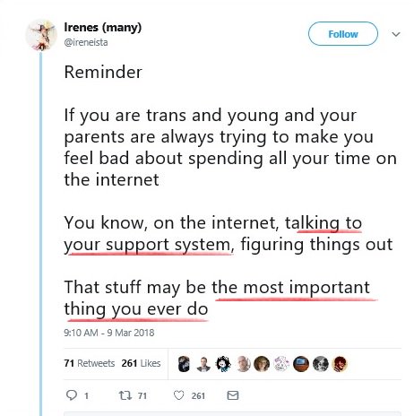 To summarize: A self-proclaimed system of headmates--at least, the alter(s) who composed that tweet--thinks confused kids finding a "support system" in online trans forums is the "most important thing they ever do". Prominent journalist Katelyn Burns agrees via quote-tweet.pic.twitter.com/yQezBbCYvO