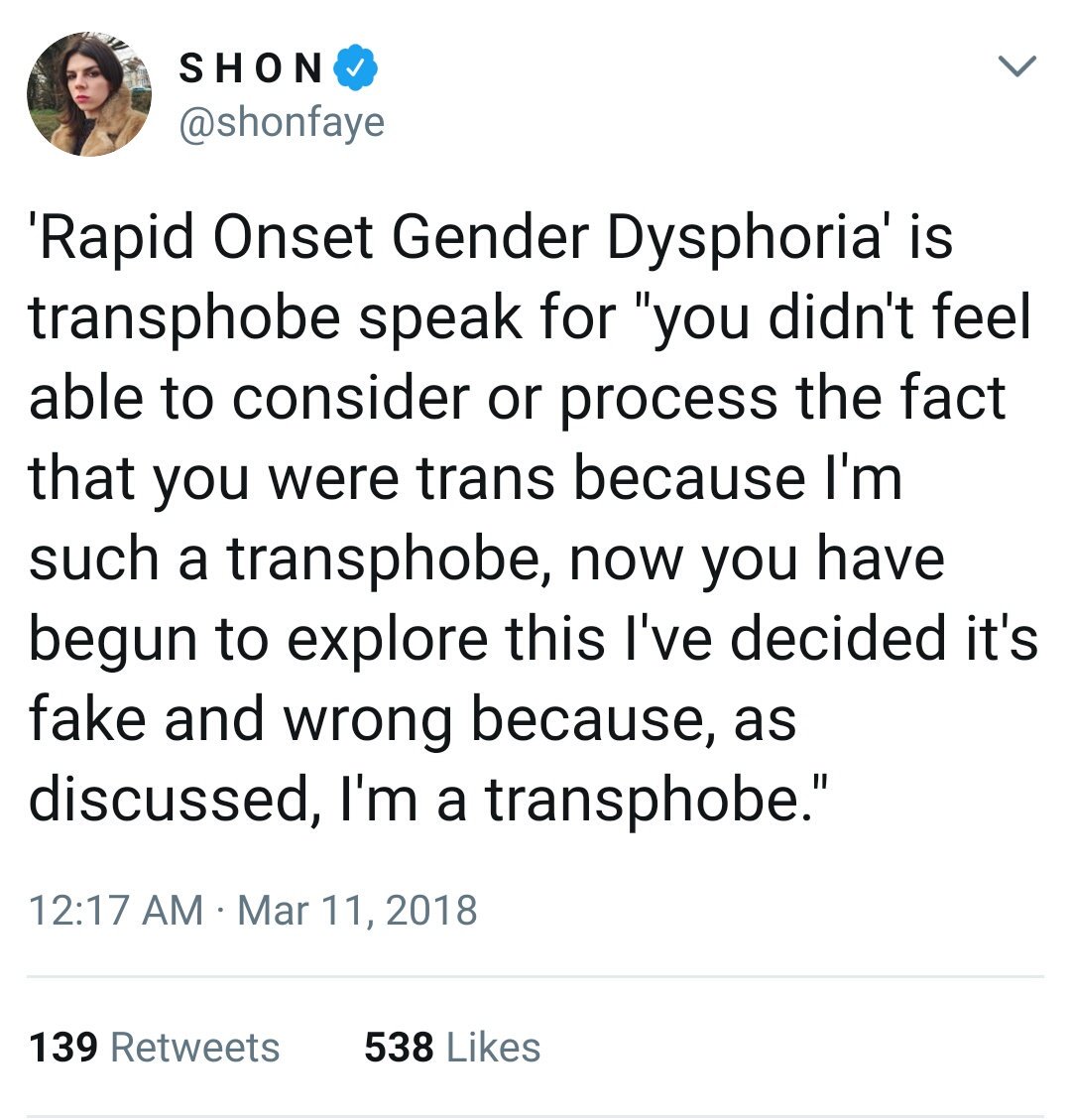 What strikes me is how obvious it is that these transwomen have no experience of female puberty. Shon posted a pic earlier with his cleavage pushed together. I haven’t taken a selfie like that since I was about 13