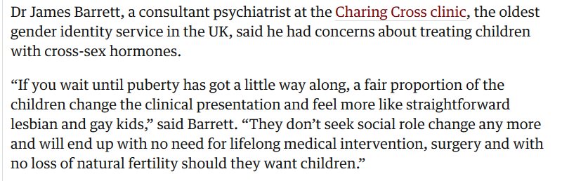 James Barrett, psychiatrist: "If you wait until puberty has got a little way along, a fair proportion of children change the clinical presentation & feel more like straightforward lesbian and gay kids." As in: You can't know until you experience puberty https://www.theguardian.com/society/2016/jul/11/transgender-nhs-doctor-prescribing-sex-hormones-children-uk … pic.twitter.com/4o4w1iAY8R
