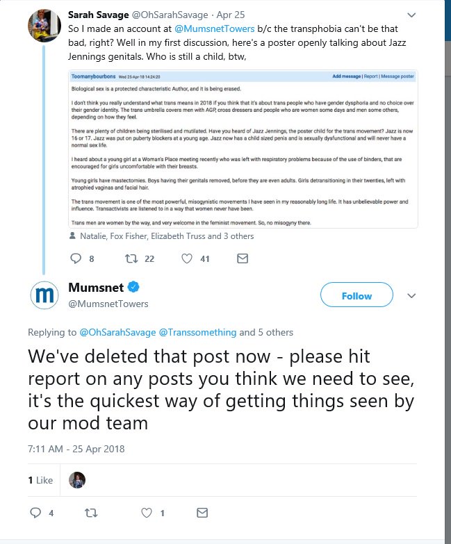 Here's one of many examples, a clip from "I Am Jazz" with discussion about "bottom surgery"--in excruciating detail. Yet @MumsnetTowers is "transphobic" for allowing its users to discuss the same kind of details?https://twitter.com/4th_WaveNow/status/978301803233234945 …