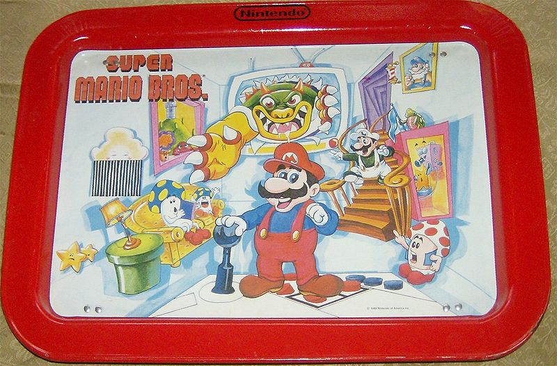 A mario-themed TV food tray featuring various Mario references in the backgroundpic.twitter.com/W1USlDKzmV