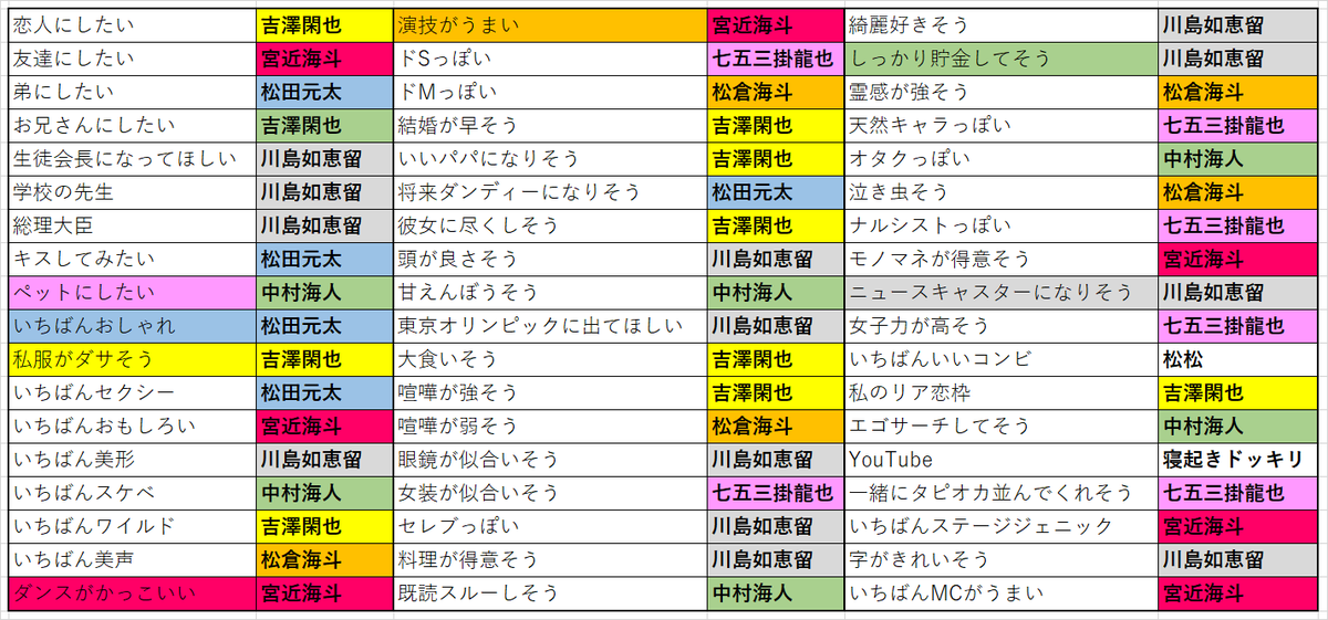 #Jr大賞 トラジャ担にとったアンケートこちら結果出しました!54項目の1位まとめです!(具体的な得票率などはブログに載せます。画像が多いので現在作成中です。)
