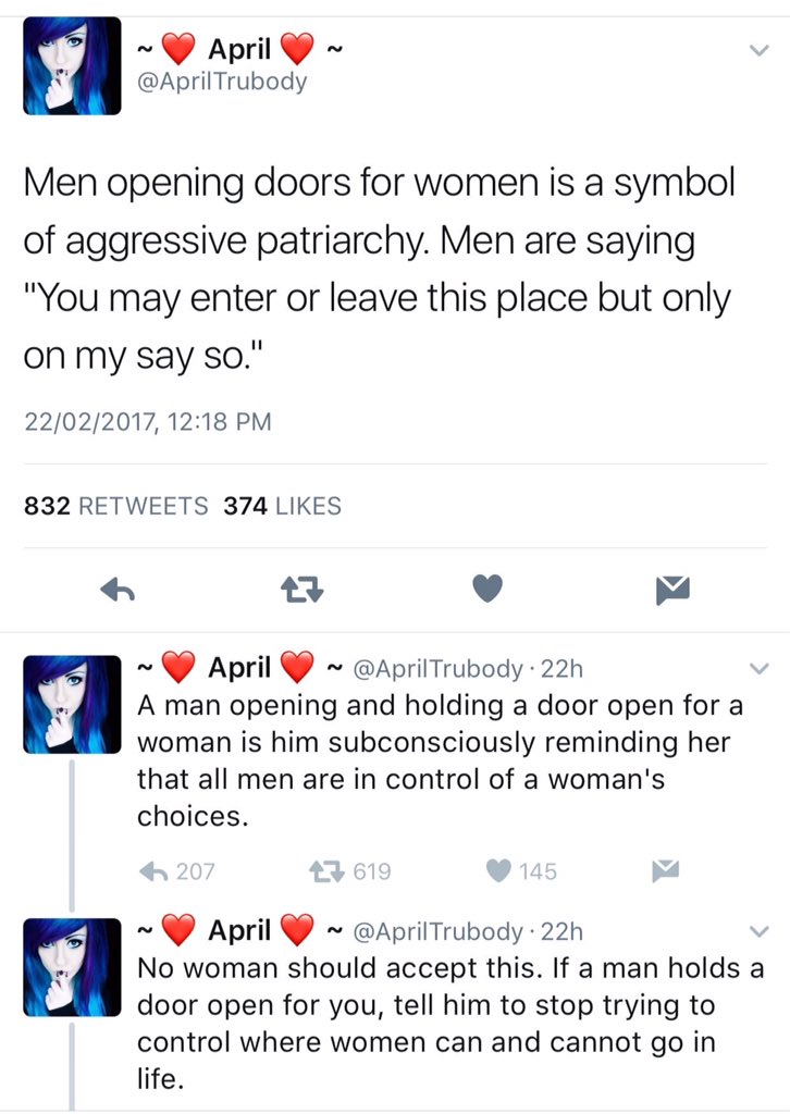 theyre bad extremists. Ex: Girls tweeting that theyre so strong at telling evil men who hold doors open for them