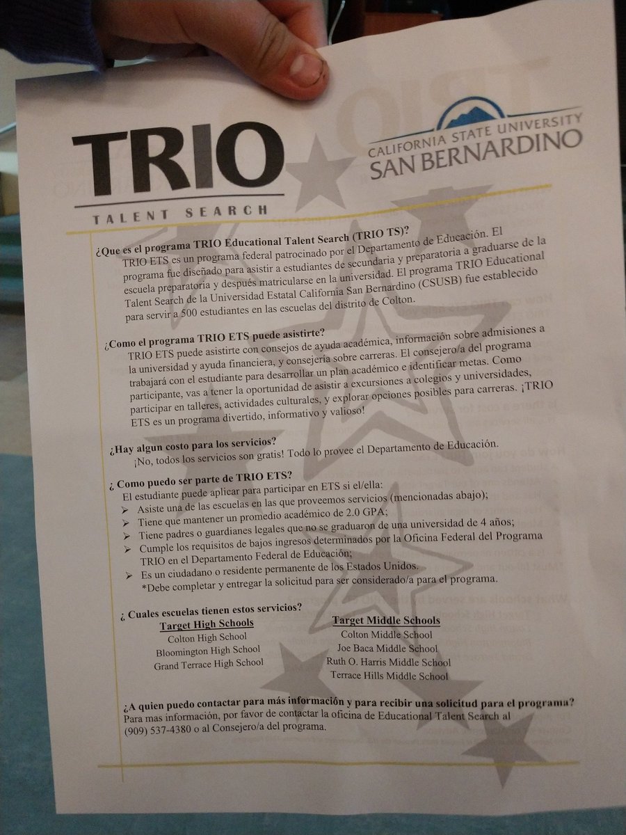 Great opportunity for our Students join the TRIO Program it's free. I was in attendance last night at Joe Baca Middle Parent Night. For info. Let me know. Both my daughters are in the program.pic.twitter.com/V09ycqrupl