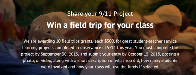#Teachers! Enter your 9/11 Day Project at http://911day.org/fieldtrip to win $500 for your class field trip. #911daypic.twitter.com/CYuSUwHHnr