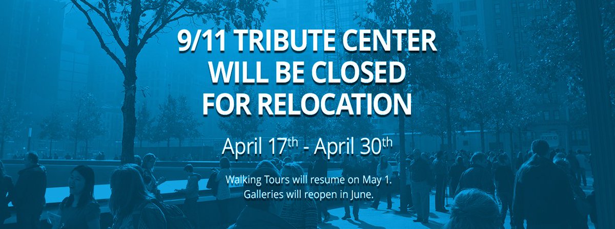 We're moving! #911TributeCenter will be closing temporarily on April 17 in order to move to a new expanded facility. http://tributewtc.org/temporary-closure-relocation …pic.twitter.com/zJVH4cAugg