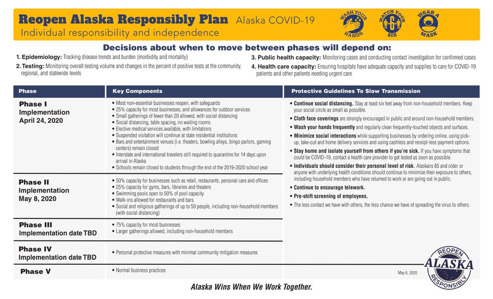 Phase 2 of the Reopen Alaska Responsibly Plan began Friday, May 8. It's up to all Alaskans to continue their personal protective measures and keep a lid on