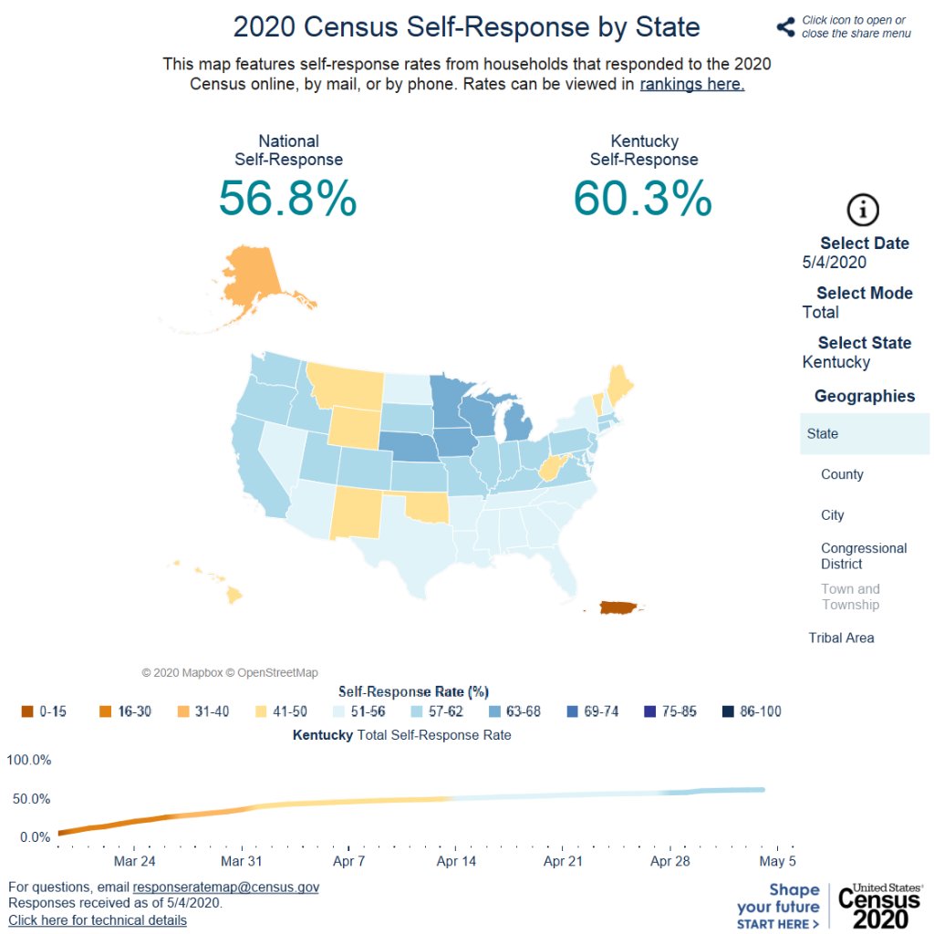 Kentucky has the highest cumulative total self-response rate (60.3%) for all Southern States, followed by Tennessee (56.1%) and Alabama (54.8%). Explore response rates across the United States at http://2020census.gov/en/response-rates ….